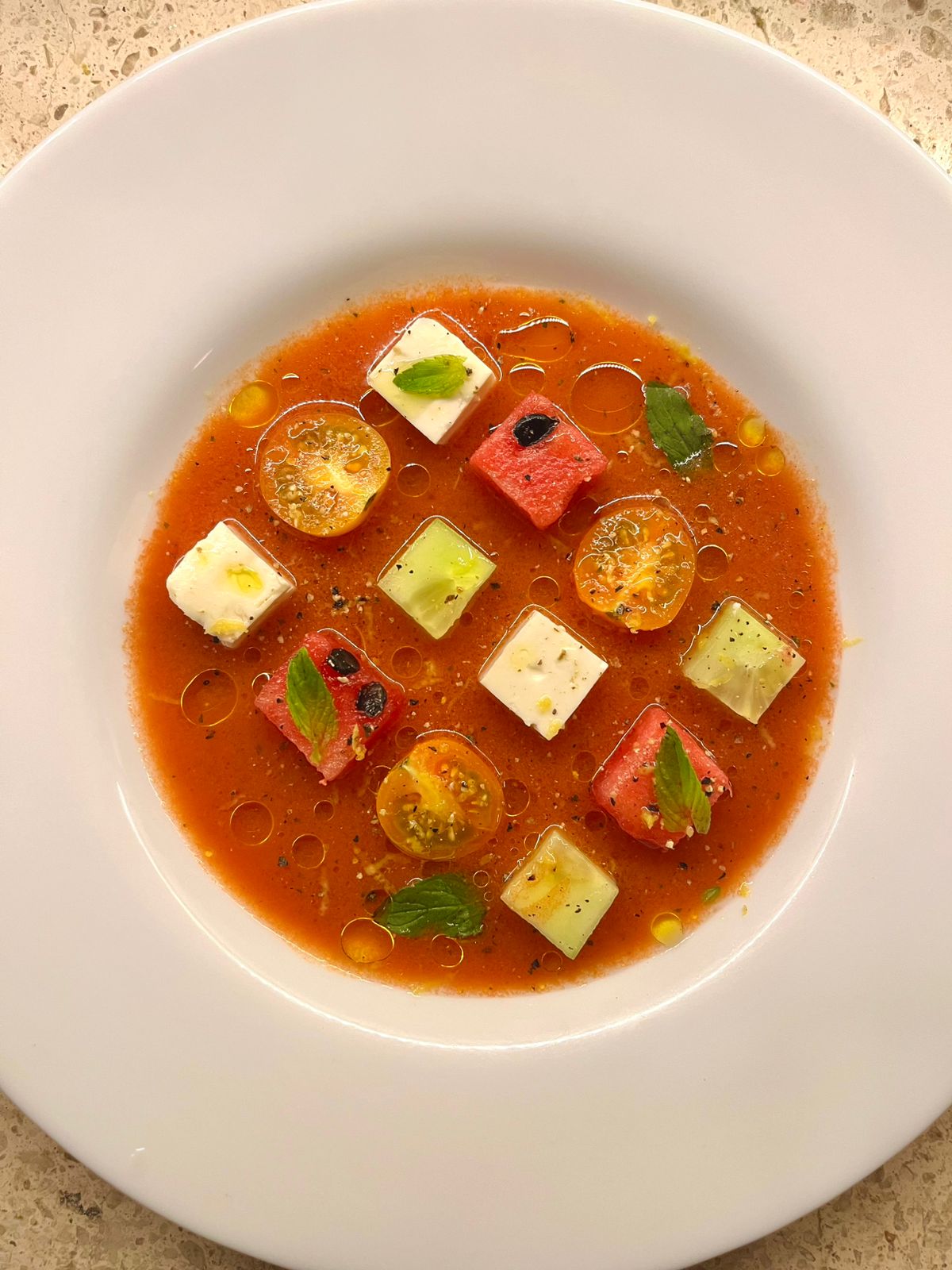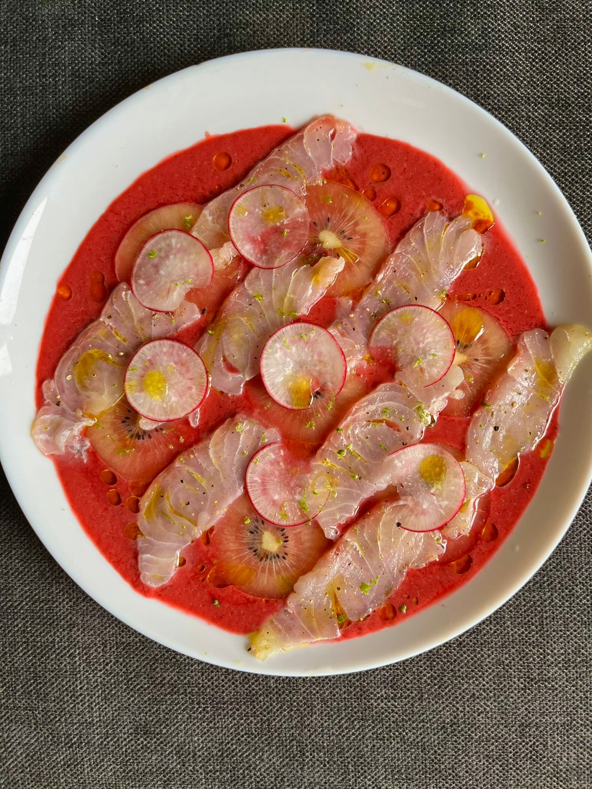 - Beetroot carpaccio, goat cheese, arugula, walnuts, balsamic vinegar