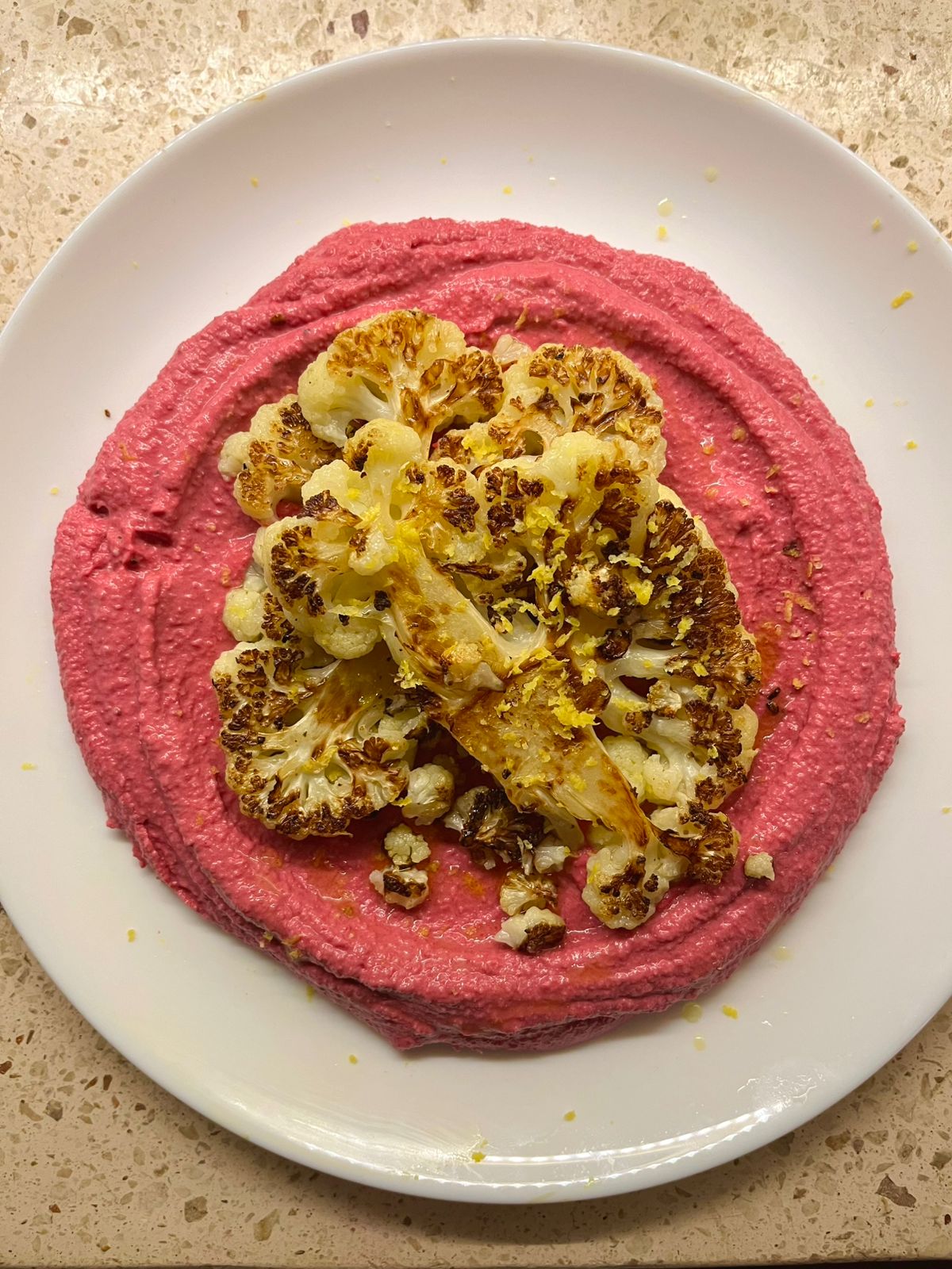 - Cauliflower Steak on a bed of hummus, homemade chimichurri sauce, toasted nuts